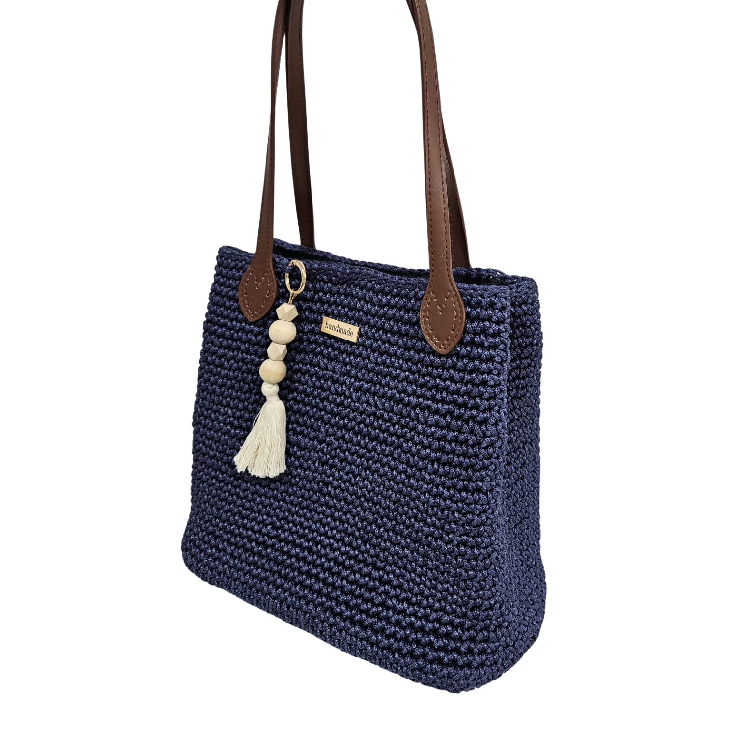 ✨ Tejido artesanal 100% a mano en trapillo 📏 Medidas generosas: 27 cm alto · 35 cm ancho · 13 cm base 👜 Asas de cuero marrón: durables, cómodas y sofisticadas 🪵 Colgante de cuentas de madera con borla: detalle boho exclusivo 🏷️ Placa handmade: sello de autenticidad artesanal 🎨 Disponible en Blanco Crudo, Azul Marino y Mostaza