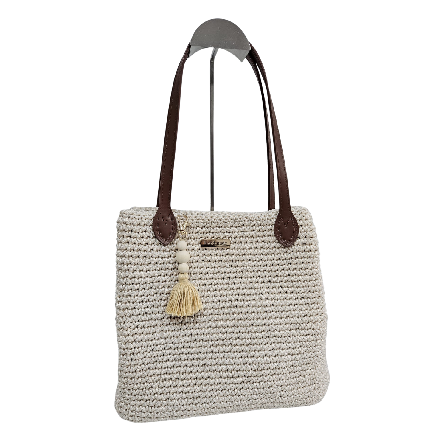 Sus asas de cuero marrón le aportan solidez y un toque boho-refinado que lo diferencia desde el primer vistazo. El colgante de cuentas de madera con borla es el detalle que lo convierte en una pieza con carácter propio, pensada para quienes no necesitan accesorios llamativos porque su bolso ya lo dice todo.
